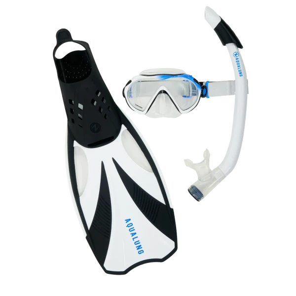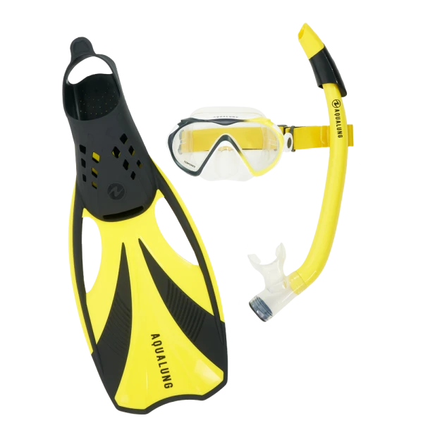Das Compass Schnorchelset von Aqualung ist ein leichter Schnorchel Set für Erwachsene bestehend aus einer bequemer Schnorchelmaske mit weicher Dichtlippe, einem einfachen Schnorchel mit Ausblasventil und ein paar leichter Schnorchelflossen mit recht kurzem Flossenblatt und angenehmen Fußteil, ein praktisches Reise Set zum Schnorcheln in warmen Gewässer.