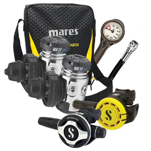 Atemregler Komplettset MK17 EVO / S600 / R105 + 1.Stufe MK17 EVO / Atemreglertasche / Finimeter / Inflatorschlauch