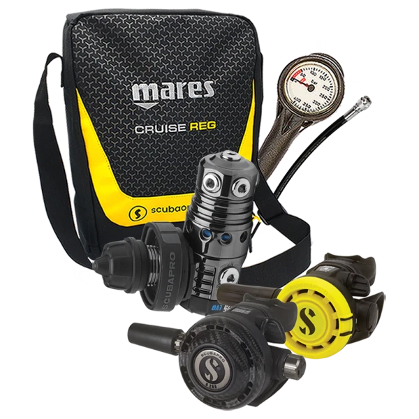 In diesem besonderen Angebot erhalten Sie diesen Leistungsstarken Scubapro Atemregler zusammen mit einem präzisen 400 bar Finimeter, einem robusten Inflatorschlauch und einer praktischen Atemreglertasche.