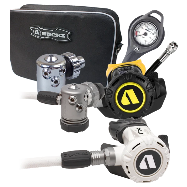 In diesem Atemregler Set, erhalten Sie den Lungenautomaten Apeks XL inkl. Octopus mit einer zusätzlichen zweiten Apeks 1.Stufe DS4 für eine komplette Kaltwasserkonfiguration und dazu ein passender Apeks Finimeter, ein Inflatorschlauch und eine hochwertige Apeks Atemreglertasche.