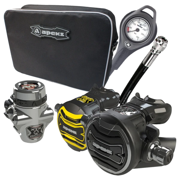 In diesem Atemregler Set, erhalten Sie den Lungenautomaten Apeks XTX200 Atemregler mit XTX40 Octopus mit einem passenden Apeks Finimeter, einem Miflex Inflatorschlauch und einer hochwertigen Apeks Atemreglertasche.