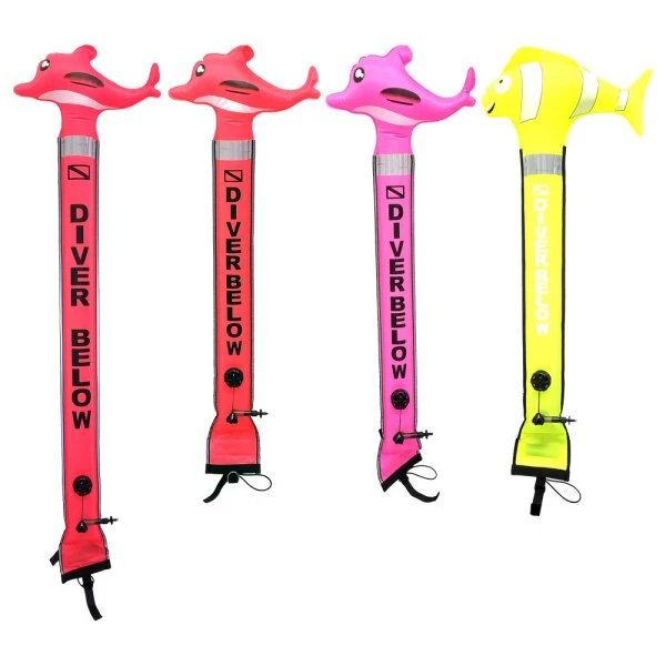 Da schaut jeder Taucher – eine innovative Tauchboje mit 100% Wiedererkennungswert! Boje mit Delfin oder Boje mit Nemo, die aber weit mehr als ein Auftriebskörper oder Boje für Kinder sind. Es handelt sich dabei um hochwertige Markierungsbojen für Taucher, Tauch SMBs aus robustem Material, mit Anschluss für Inflatorschlauch, Mundstück und Öffnung für Füllung mit alternativer Luftversorgung, Schnellablass & Überdruckventil, durchaus geeignet als vollwertige Signalbojen für Taucher und nicht nur als Schwimmboje für Kinder.