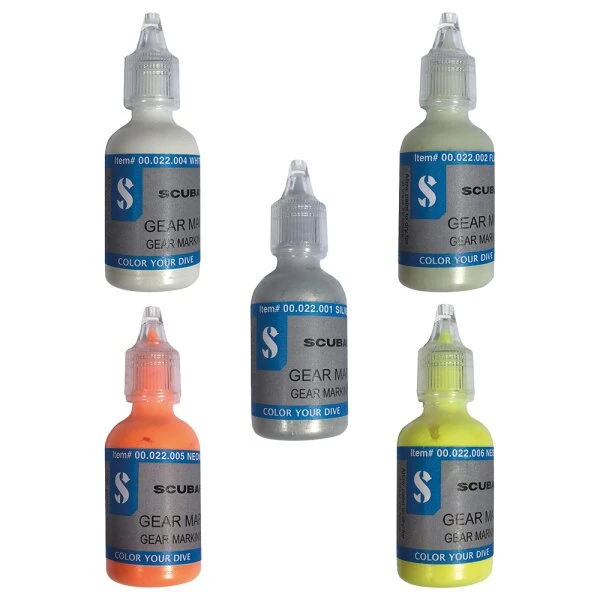 In unserem online Tauchshop finden Sie die Scubapro Gear Marker Farbe in vielen verschiedenen, teilweise fluoreszierenden Farben, in gut dosierbaren 30ml Flaschen mit einer feinen Spitze die direkt zum Schreiben und markieren geeignet ist.