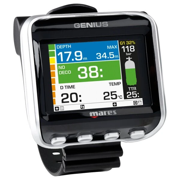 Der neue Mares Genius Tauchcomputer wurde als Hochleistungs-Tauchcomputer gedacht, denn er bietet weit mehr als ein Standard-Tauchcomputer. Der Mares Genius Tauchcomputer ist auch ein idealer Tauchlehrer Tauchcomputer oder Tauchcomputer für Tech-Taucher, denn er ist Nitrox- und Trimix-fähig (Hypoxic, Normoxic), Multigas fähig (bis zu 5 Gase) und kommt bereits in der Planungsphase auch den anspruchsvollsten Tauchern entgegen. Denn der neue Mares Genius Tauchcomputer bietet jenseits üblicher Tauchgangsplanung einen Dekompressionstauchgangs Planer mit zusätzlicher Oberflächeninterval Funktion und brand-neue und patentierte erwartete Deko und „Runaway-Deko-Alarm“ Features.
