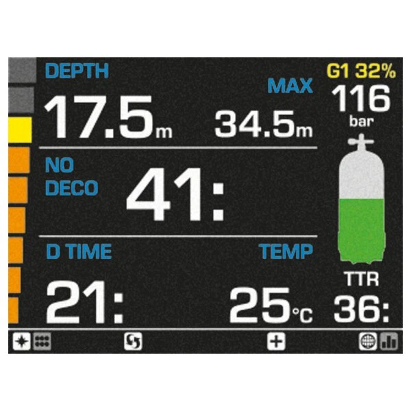 Zum Beispiel kann Ihnen der neuen Genius Tauchcomputer eine akkurate Tauchkarte während des Tauchgangs präsentieren, einen Digitalen Kompass mit vollständiger Neigungskompensation anzeigen, eine farbcodierte Anzeige des Tankdrucks gut lesbar einblenden, ein Gewebesättigungsdiagramm mit genauen, personalisierten Daten darbieten, oder sogar Ihre persönliche Daten einschließlich Foto darstellen.