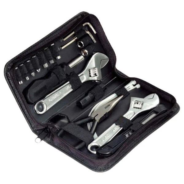 Inhalt: 2 Inbusschlüssel, 2 verstellbare Rollgabelschlüssel (Engländer), eine Spitzzange, einen Schraubendreher mit wechselbarem Aufsatz, ein paar Kabelbinder, ein Cuttermesser und einen O-Ring Entferner