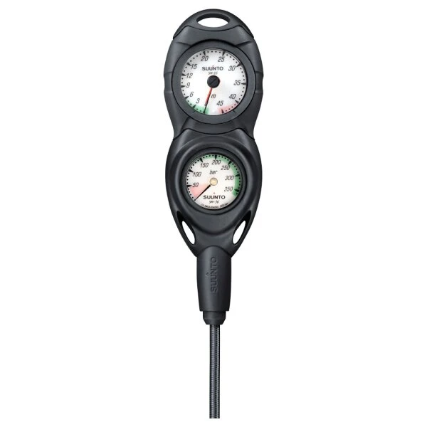 Diese Tauchinstrumentenkonsole von Suunto CB-2 IN LINE/300/45 COMBO vereint einen hochwertigen Suunto Druckmesser, also einen Suunto Finimeter, mit einem präzisen Suunto Tiefenmesser.